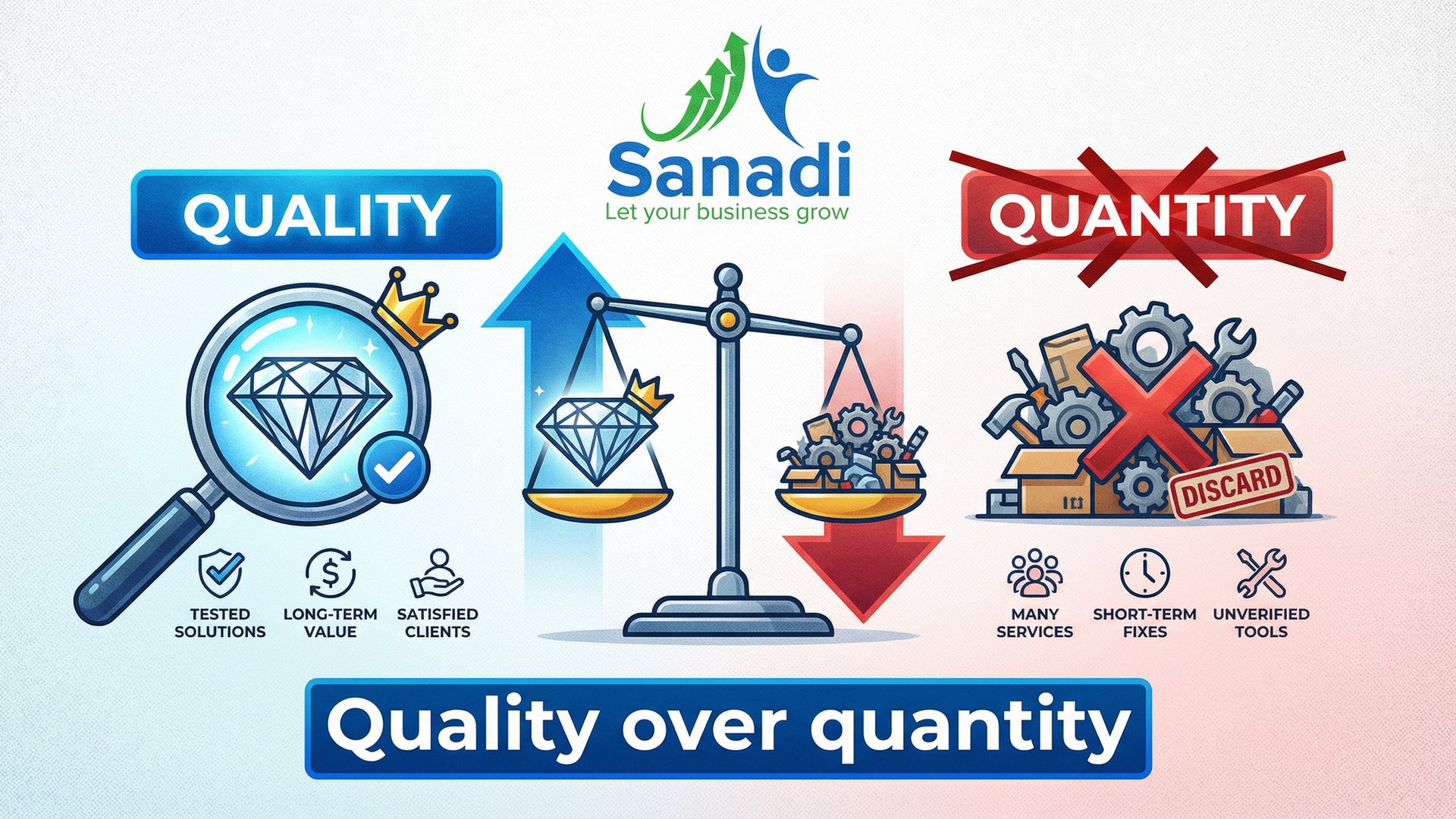Het doel is niet om zoveel mogelijk diensten te verkopen, maar om hoogwaardige oplossingen te leveren. Alle services en tools worden getest op effectiviteit en waarde, met focus op langdurige resultaten en tevreden klanten.